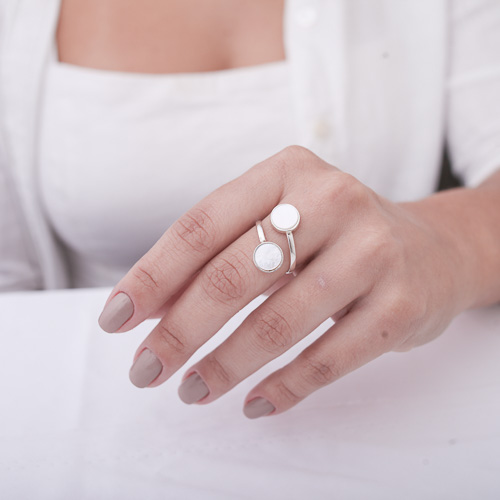 O anel de madrepérolas (Original) é uma bela peça de prata 925 com duas pedras em madreperola (Original) em cada ponta. Assim como o modelo anterior, este anel também é regulável, o que permite ajustá-lo de acordo com o tamanho desejado. Feito com materiais de qualidade, o anel apresenta um design elegante e sofisticado, sendo uma opção encantadora para complementar seu visual. As madrepérolas adicionam um toque de delicadeza e charme à peça, tornando-a ainda mais especial.
