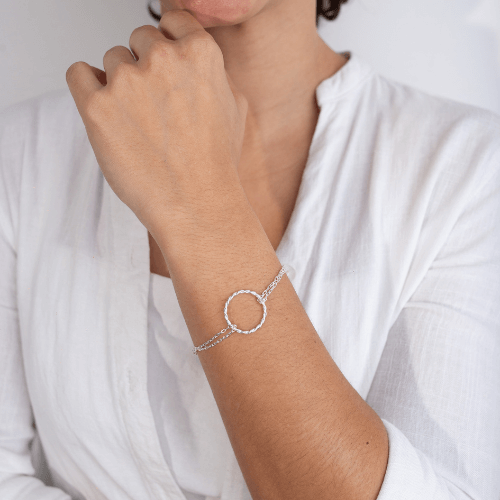 A Pulseira Dupla Círculo Torcido é uma peça sofisticada feita em prata 925, que combina design moderno com detalhes delicados. Apresenta um círculo central retorcido de aproximadamente 1,8 cm de diâmetro, que traz textura e movimento ao visual. A estrutura da pulseira é composta por duas partes: um lado fechado que envolve o pulso com aproximadamente 7,5 cm e outro lado com fecho, totalizando cerca de 18,5 cm de comprimento, garantindo ajuste perfeito e conforto. Ideal para quem busca uma joia marcante, elegante e versátil para usar em diversas ocasiões.